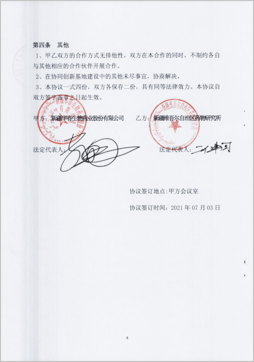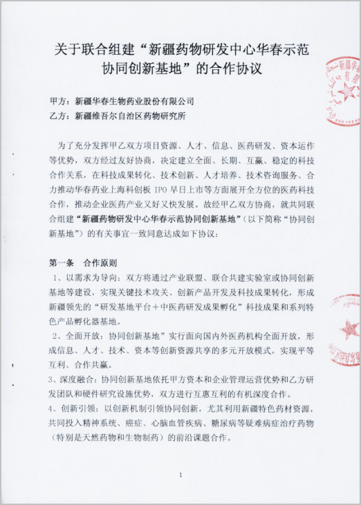 2)華春生物藥業(yè)與新疆維吾爾自治區(qū)藥物研究所聯(lián)合組建“新疆藥物研發(fā)中心華春示范協(xié)同創(chuàng)新基地”。宗旨:充分發(fā)揮雙方項目資源、人才、信息、醫(yī)藥研發(fā)、資本運作等優(yōu)勢,在科技成果轉化、技術創(chuàng)新、人才培養(yǎng)、技術咨詢服務、合力推動華春藥業(yè)上海科創(chuàng)板IPO早日上市等方面展開全方位的醫(yī)藥科技合作,推動企業(yè)醫(yī)藥產(chǎn)業(yè)又好又快發(fā)展。